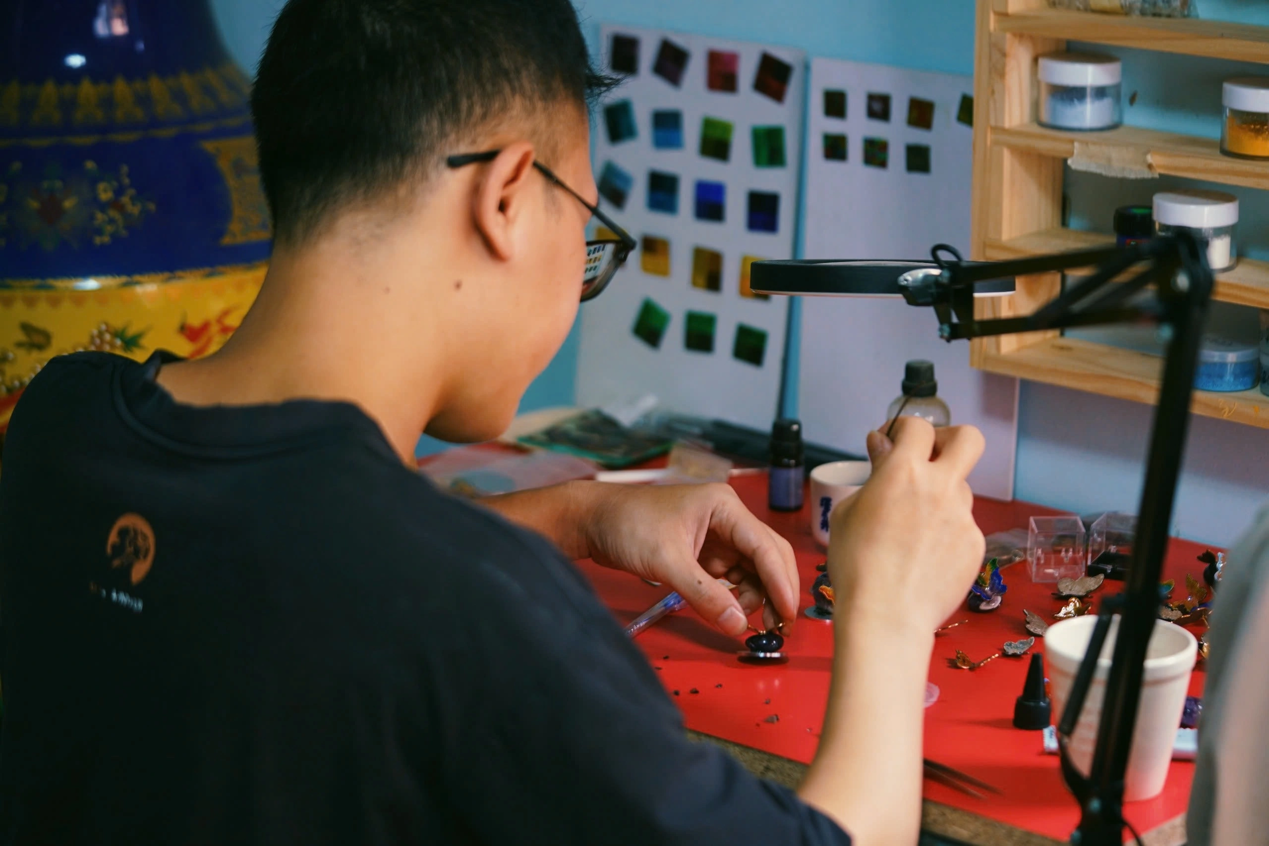 Rong ruổi trên hành trình tìm hiểu về Pháp Lam, tụi mình có duyên được gặp gỡ với nghệ nhân Trương Thanh Tùng – người sáng lập Lam Sắc – Lam Việt Họa Sắc.Anh Trương Thanh Tùng đang thực hiện tráng men tại xưởng nhà mình